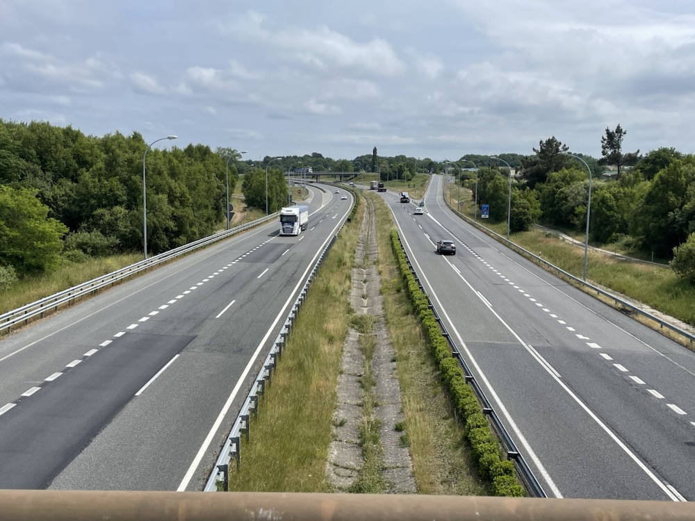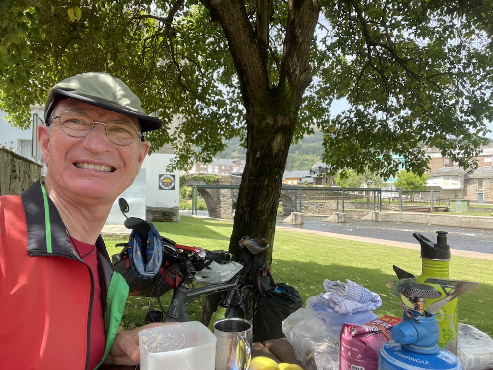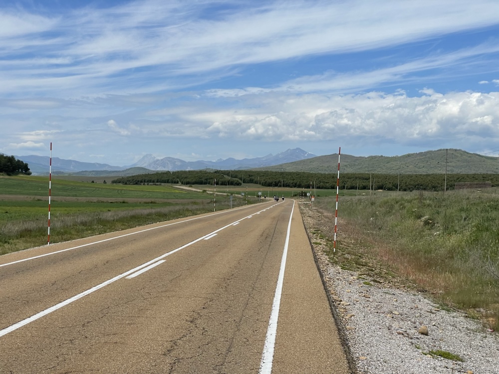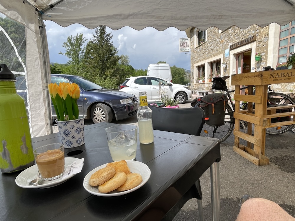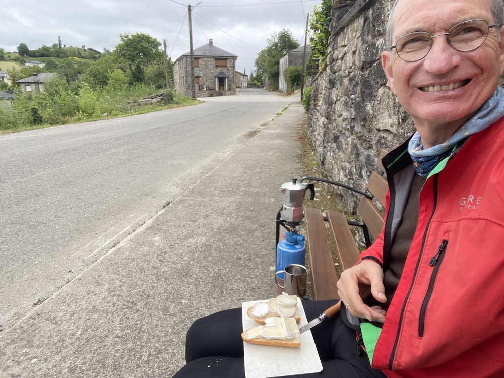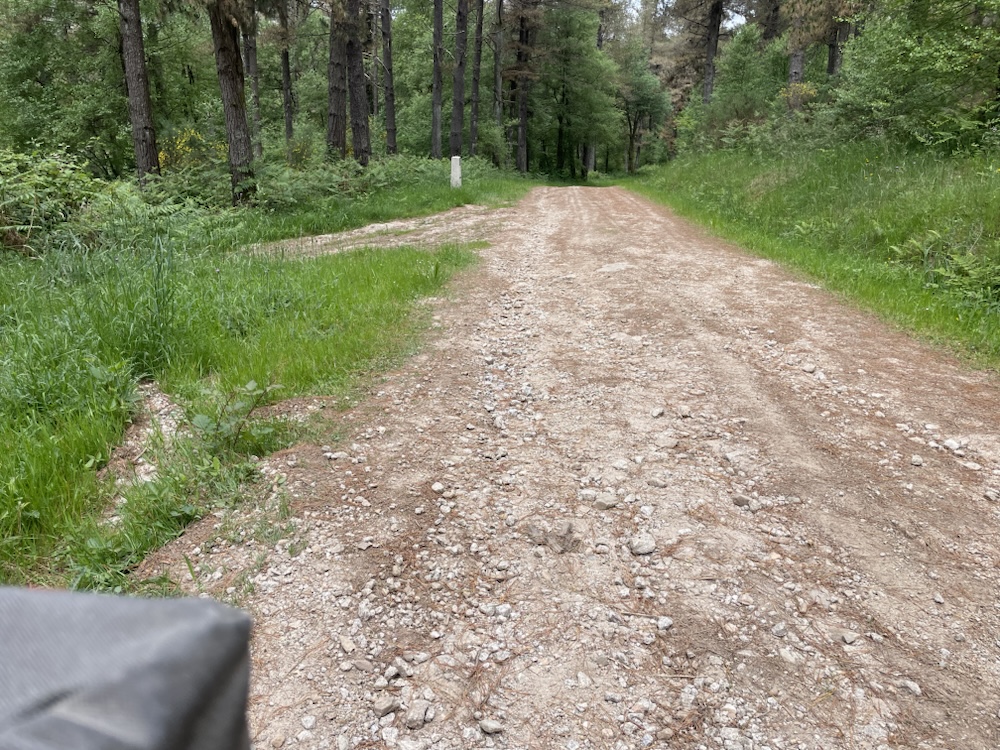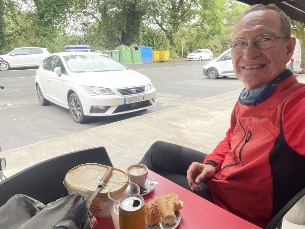 12.58 Uhr – Das erste Müsli, Rapunzel Original Müsli mit Apfelstücken und einem kleinen Naturjoghurt, war ganz vorzüglich. Inzwischen rasen wir durch die endlosen Baumplantagen der Les Landes auf dem Weg nach Dax. Durch diese Gegend sind wir vor zwei Jahren auf dem Weg nach San Sebastián lange geradelt, siehe Tour 2023.