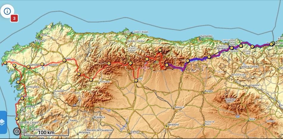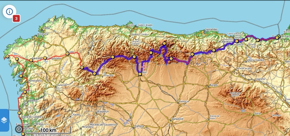 Mit etwa 2.700 km ist das eine enorme Strecke für die ich gut sechs Wochen brauchen werde, zuzüglich An- und Abreise. Dafür führt sie mich durch das landschaftlich sehr reizvolle Nordspanien, inklusive Santiago, zu vielen bedeutenden Städten und Landschaften Portugals und schließlich in das herrliche Andalusien.