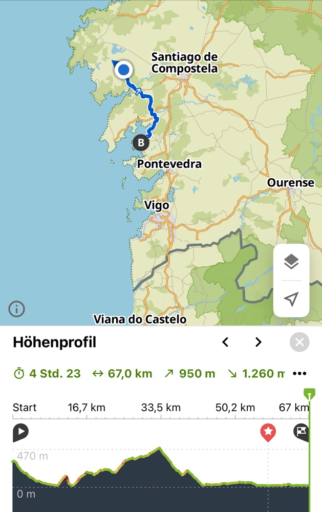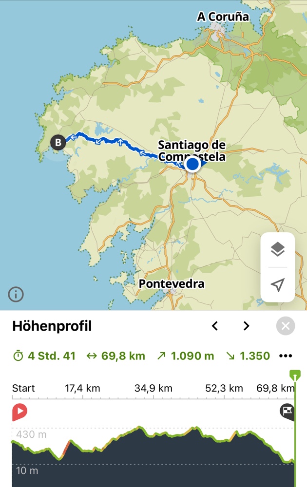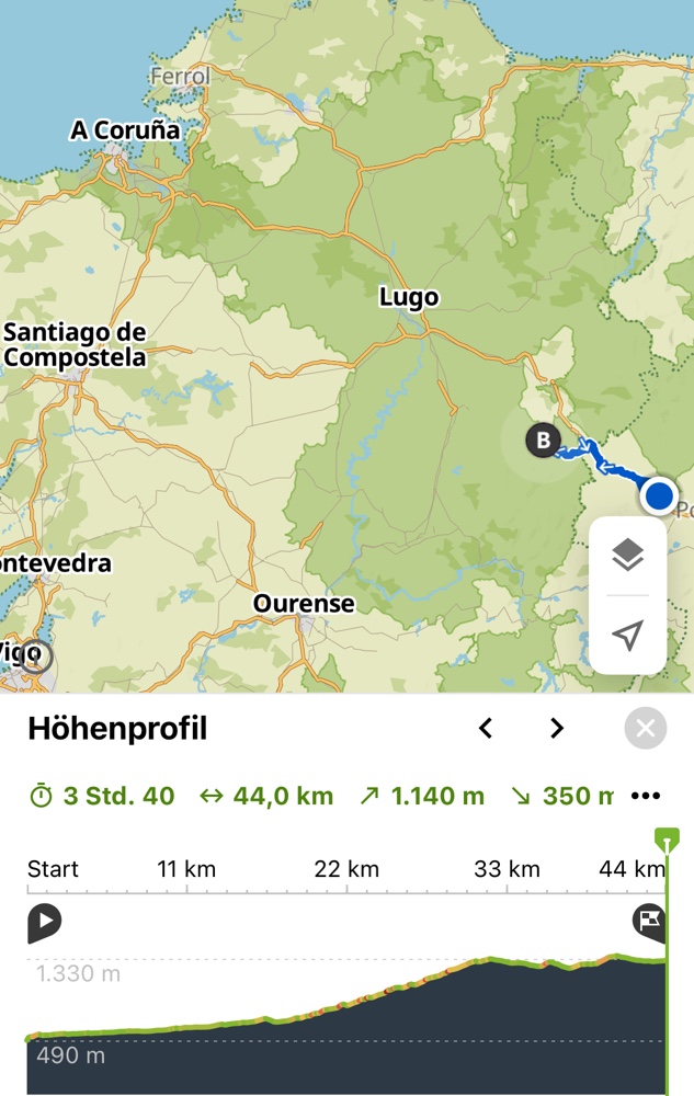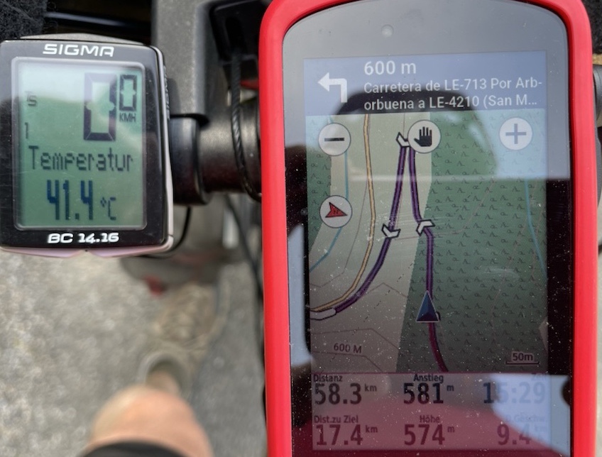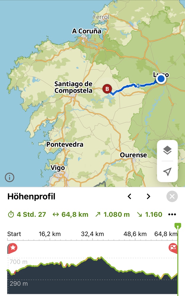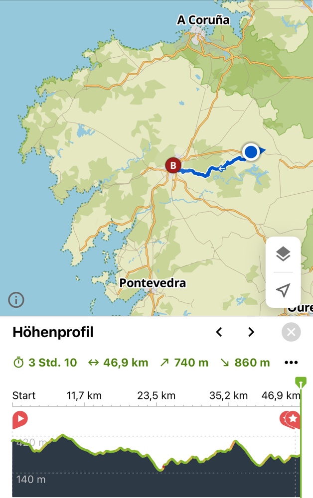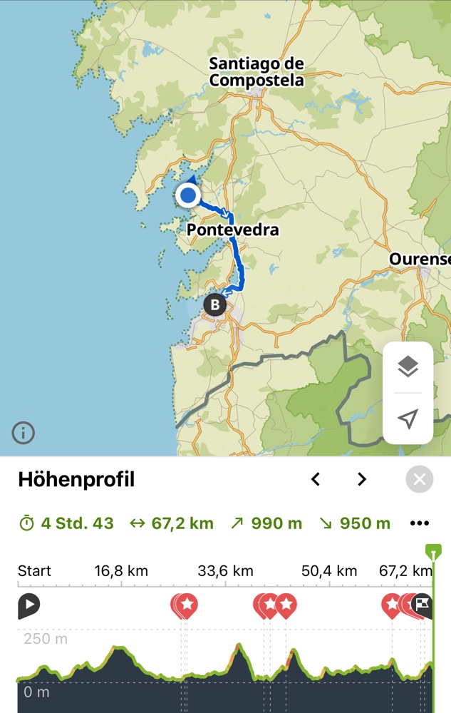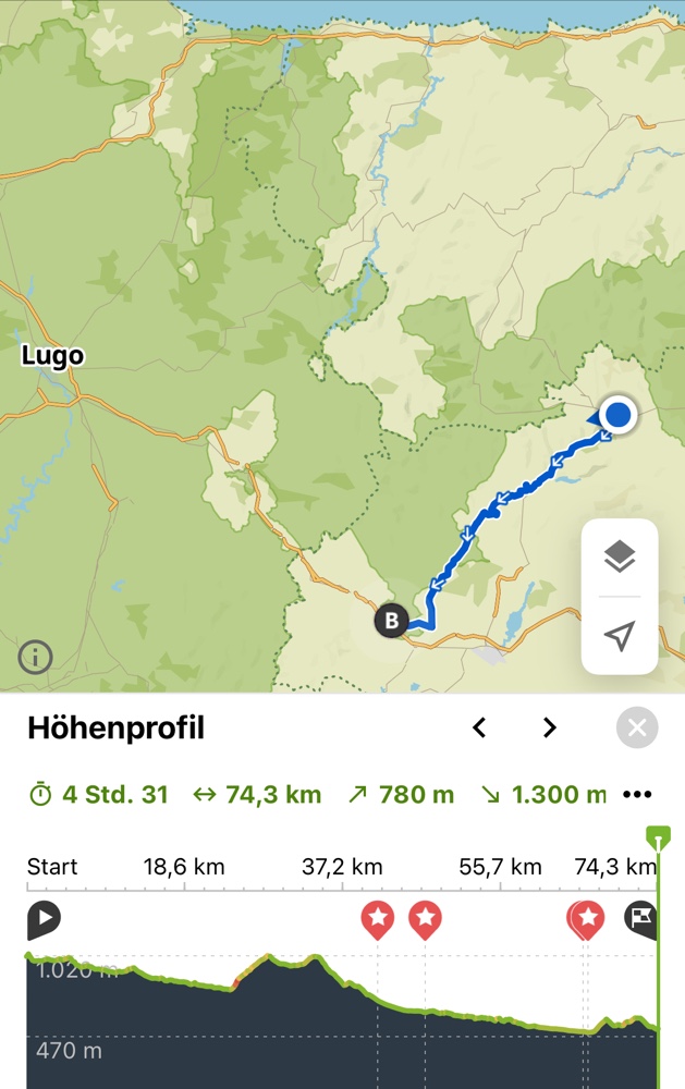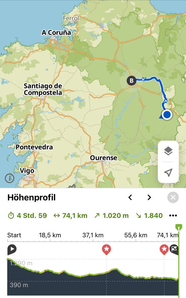 17.00 Uhr – Den größten Teil des heutigen Tages habe ich mit Streckenkontrolle verbracht. Alle Tagesetappen sind diesmal einzeln in Komoot abgelegt. In einigen habe ich tatsächlich noch Treppenabschnitte und geröllige oder sandige Passagen gefunden, an denen ich nun vorbeigeplant habe. Den Rest werde ich vor Ort sehen.