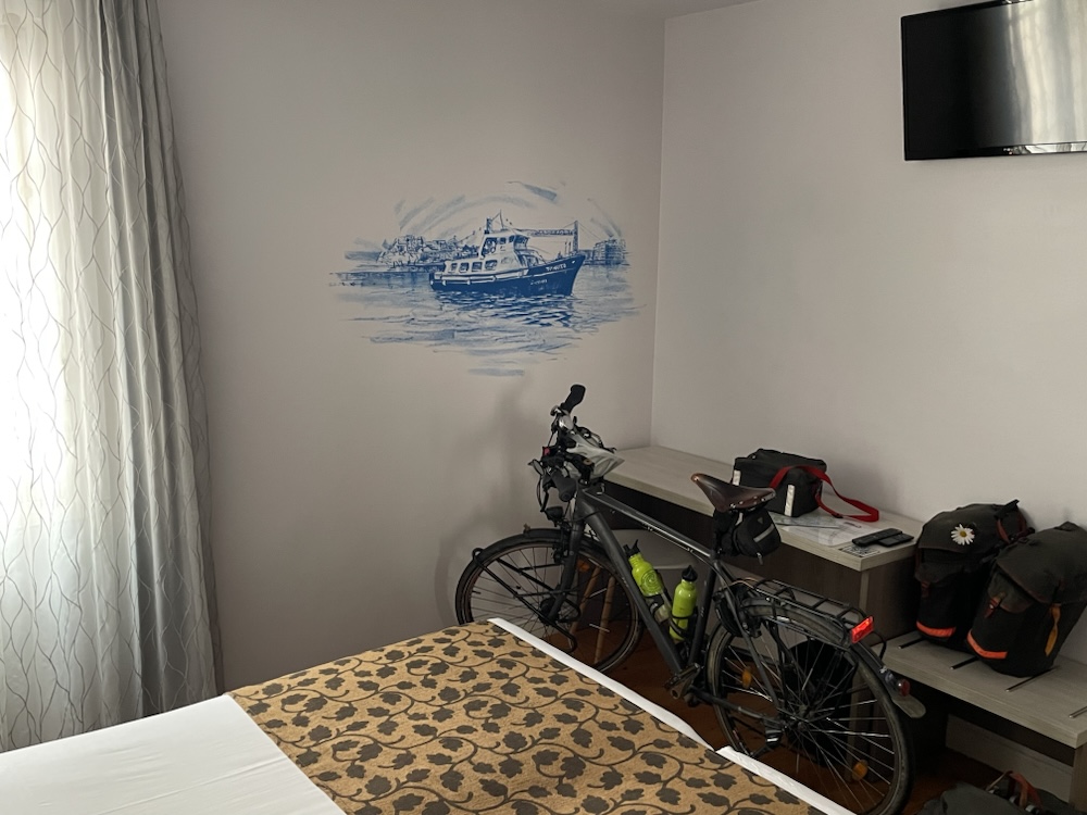 16.09 Uhr – Nasse Ankunft am großen Hotel. Das Fahrrad darf hinter die Rezeption ins Büro. Frühstück ab 7.30 Uhr und Abendessen ab 20 Uhr. Das entspricht im Wesentlichen ja meinem Rhythmus. Der Mann an der Rezeption war sehr freundlich, konnte gut Englisch, musste meine Zuversicht für einen trockenen Tag morgen aber deutlich dämpfen.