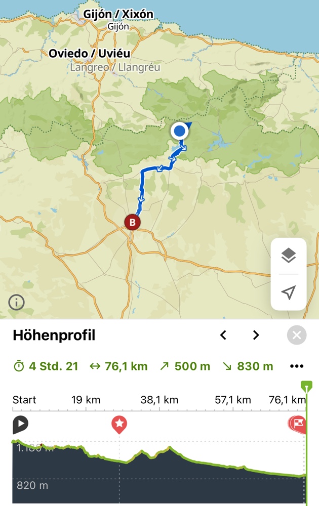 Bei dieser Streckenkontrolle schaue ich mir die Fotos an, die auf Komoot abgelegt wurden. Da waren sehr viele sehr schöne Orte und Landschaften zu sehen, auf die wir (Ihr und ich) uns freuen dürfen.