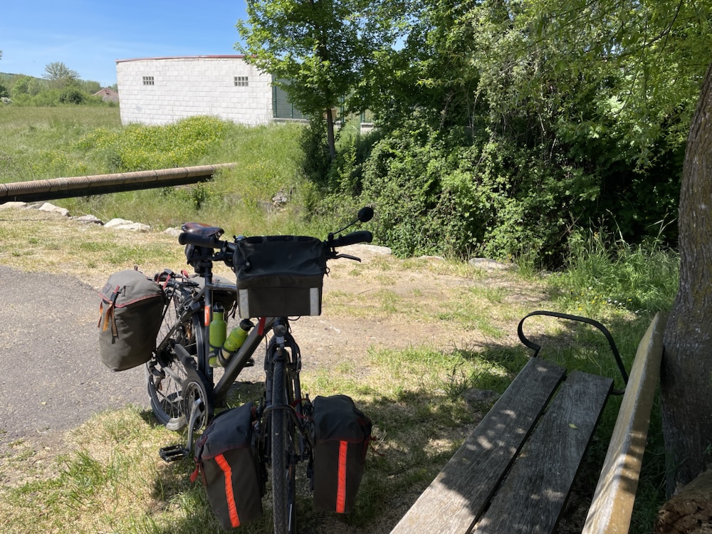 12.23 Uhr – Alles ist in den Packtaschen verstaut, auch die Werkzeugtasche und die zweite grüne Wasserflasche, die beide normalerweise am Rad befestigt sind. Für den Transport des Rads außen am FlixBus, bzw. innen, falls es doch keinen Fahrradträger gibt, sollte nichts Unnötiges am Rad sein.