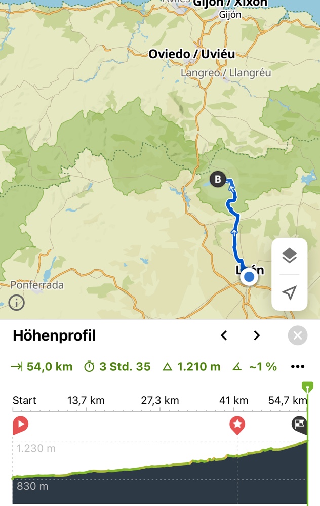 Wenn ich im Mai starte, könnte es im Gebirge Galiciens und Asturiens durchaus kalt und regnerisch sein, auch mit viel westlichem Gegenwind. Die Berge reizen mich aber mehr als der spanische Jakobsweg. Weil ich das Rioja und die Kathedrale von Burgos verpasse, nehme ich für die Kathedrale von Léon einen Umweg in Kauf. Bei Lagos treffe ich auf den Camino Primitivo, der kurz darauf dann in den Hauptweg mündet, der als EuroVelo 3 für Radfahrer markiert ist. Ihm will ich bis zum Cabo Fisterra, dem spanischen Ende der Welt, folgen. Die vielen Highlights in Portugal zähle ich hier gar nicht auf, sie sollen während der Fahrt bewundert werden.