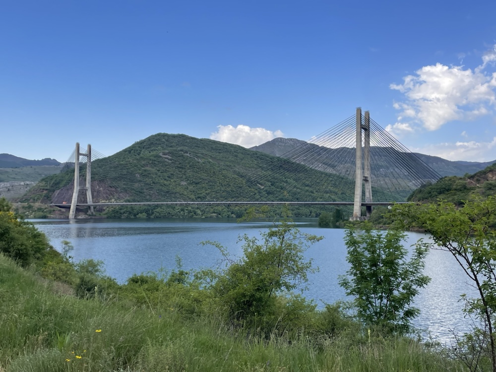 Im Hintergrund ist schon die Autobahnbrücke zu sehen, die sich über das tief eingeschnittene Tal spannt.