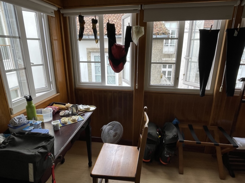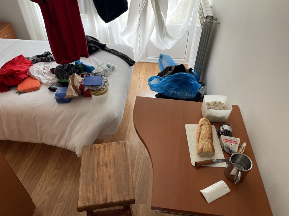 Leider hat die volle Wasserflasche, die ich für die Busfahrt im Gepäck hatte, nicht ganz dichtgehalten. Glücklicherweise war sie in einer Plastiktüte. Trotzdem fühlen sich die Sachen in dieser Tasche feucht an. Ich sollte sie also heute Abend alle zum Trocknen ausbreiten.