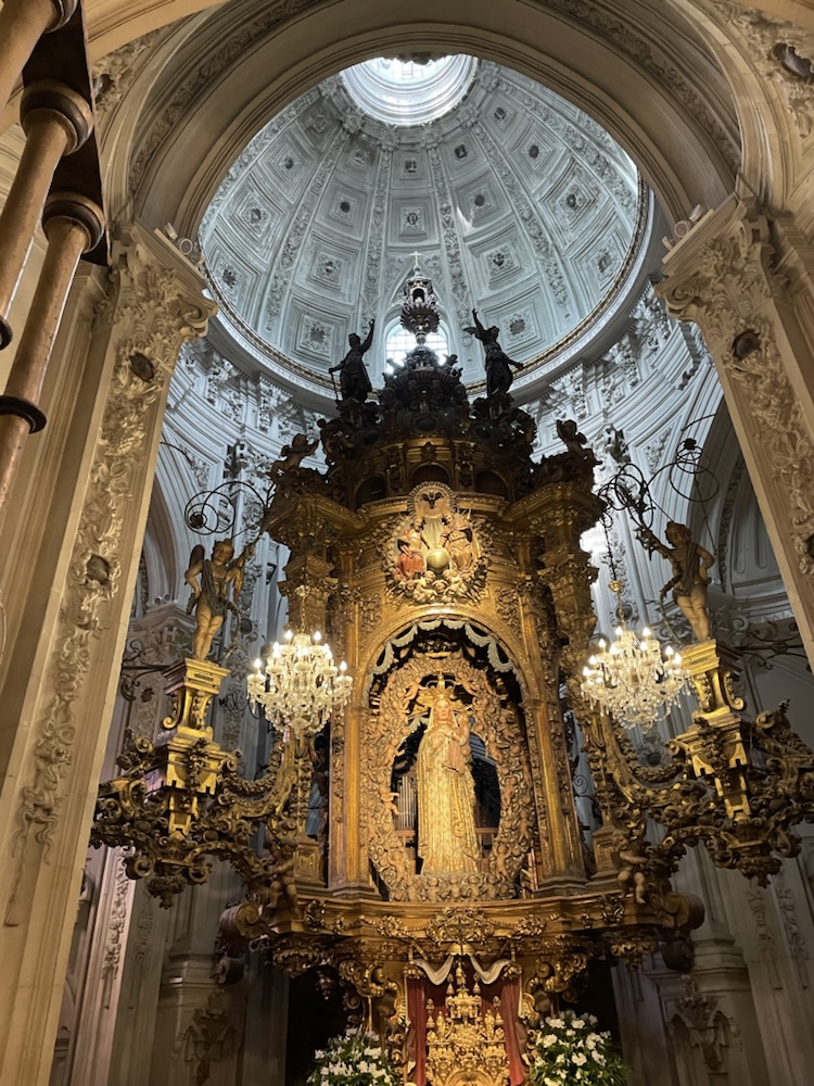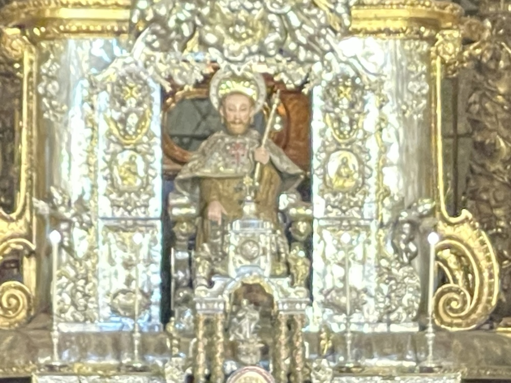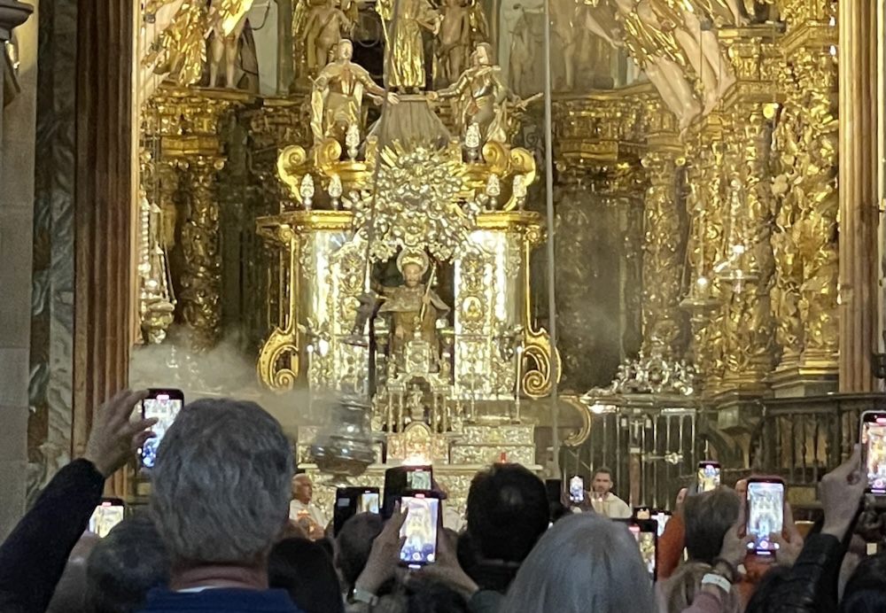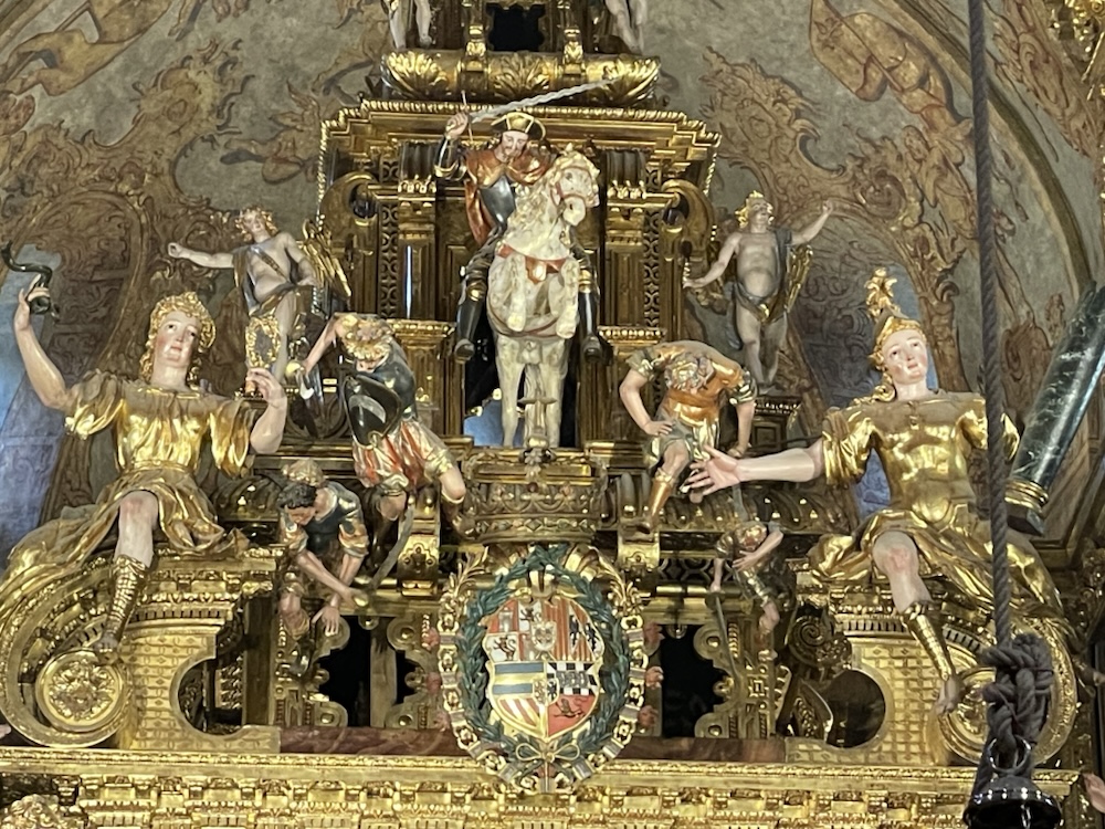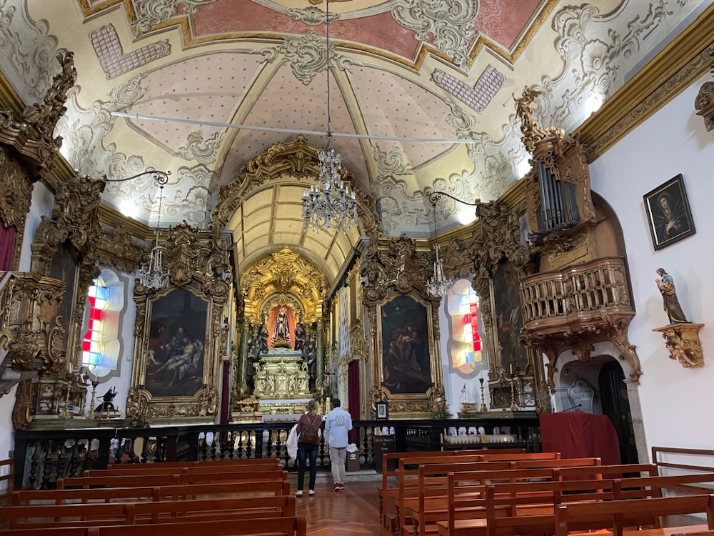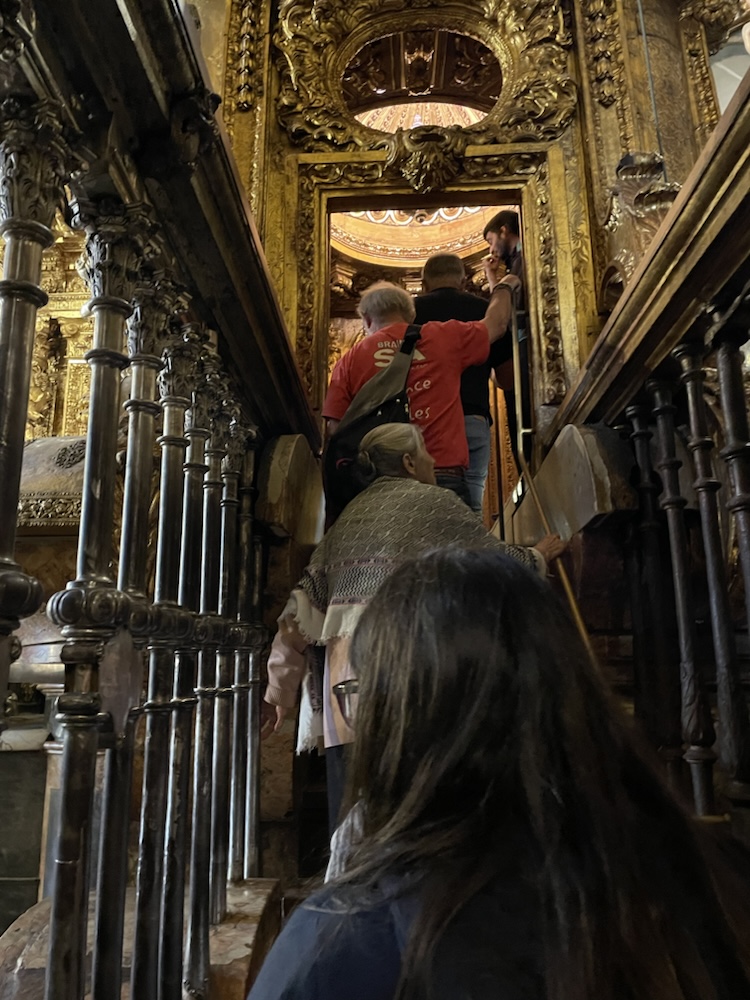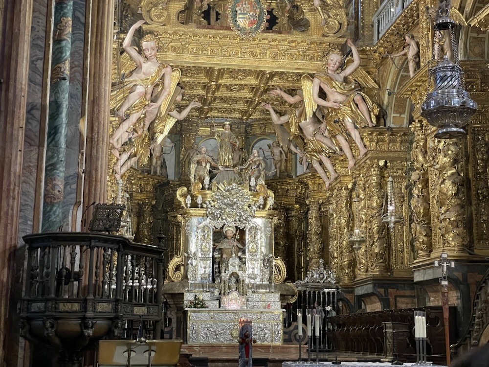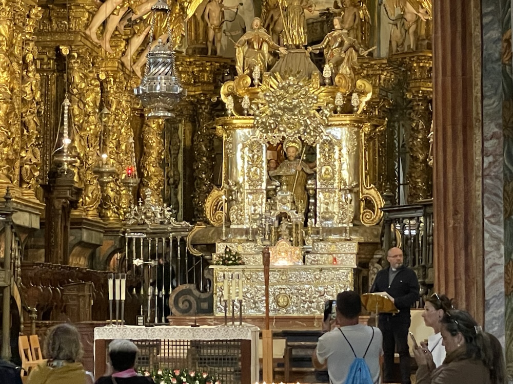 An beiden Seiten große vergoldete Altäre. Hier wird geschmückt für eine Beerdigung.