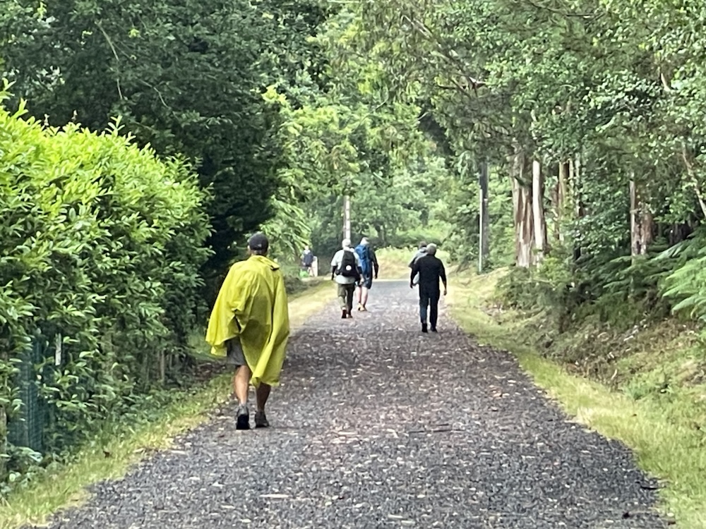 Hier sind viele Leute mit Wanderrucksäcken in unterschiedlichen Größen. Einer hat einen kleinen zweirädrigen Anhänger dabei, quasi einen Rucksack auf Rollen mit den Wanderstöcken als Deichsel eingehängt in einem Geschirr, das unter seiner Regenjacke rausguckt.