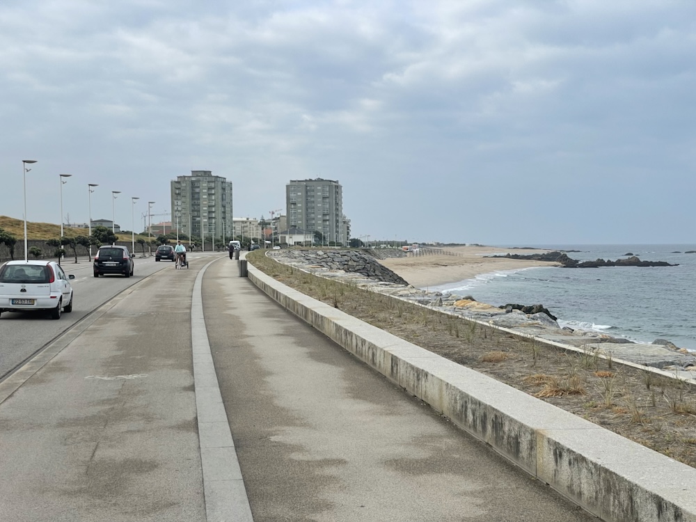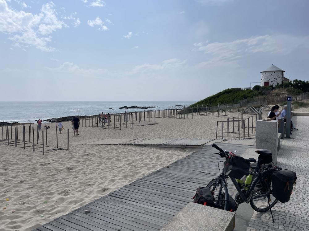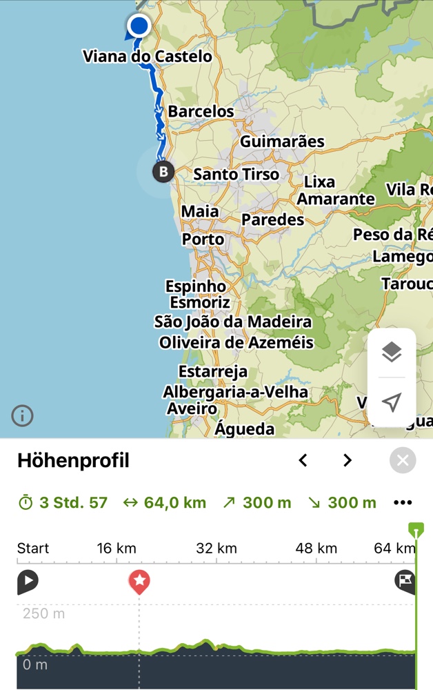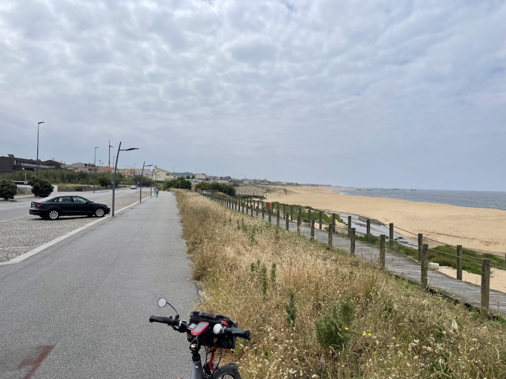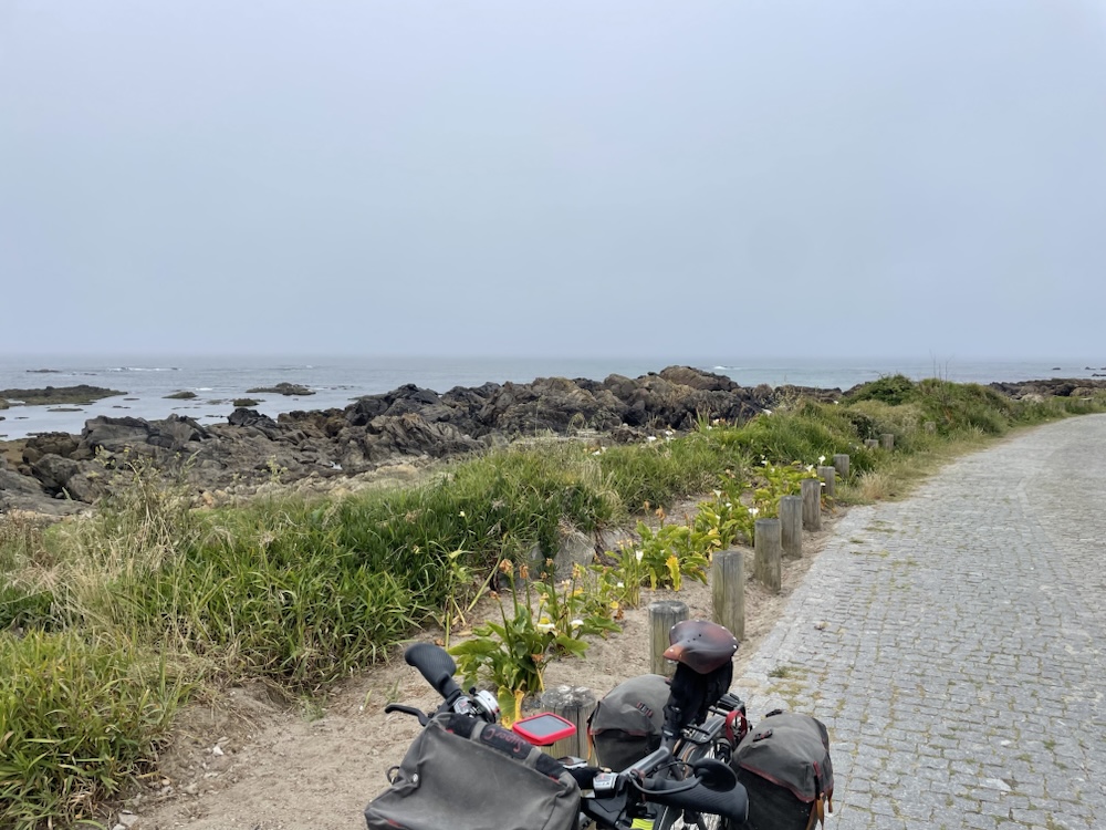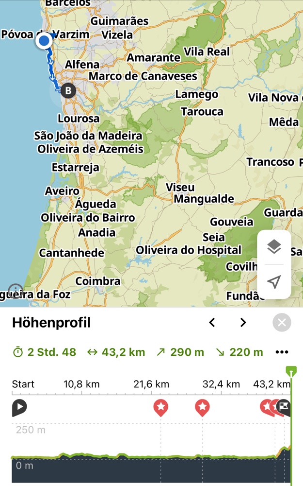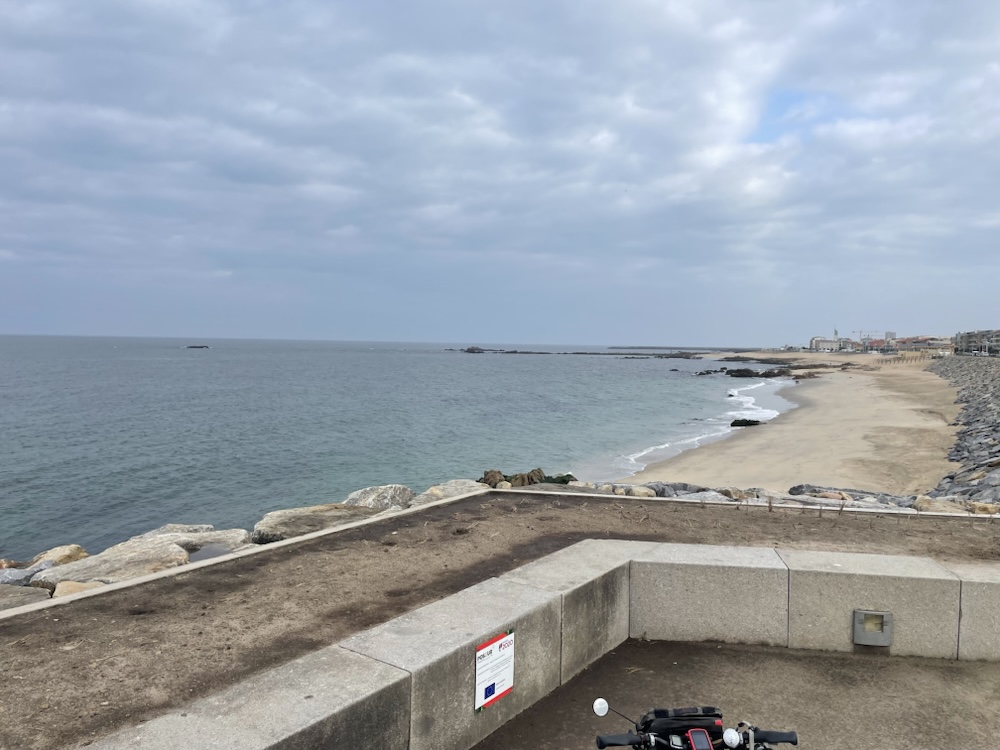 Die heutige Etappe ist wieder sehr flach. Nur am Ende geht es in Porto anscheinend etwas bergauf. Die Strecke führt die ganze Zeit direkt am Meer entlang. Mal gespannt, wie man sie fahren kann. Erstmal habe ich wieder Gegenwind.