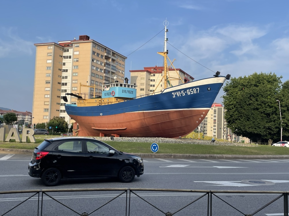 12.54 Uhr – Kreisverkehr mit riesiger Fischreuse. Noch 12 km.