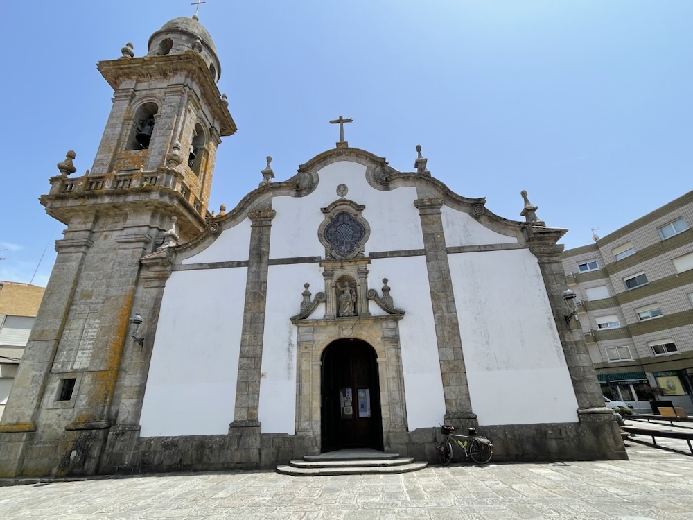 8.40 Uhr – Noch bei Póvoa. Wieder eine Kirche mit Leuchtturm. Auf dem Radweg wurden gerade alle Radfahrer von den Wassersprengern für den Rasen mehrfach nass gemacht.