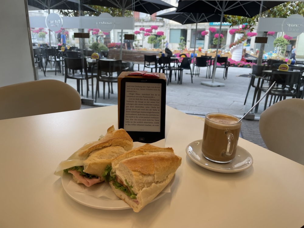 Nun räume ich schon mal so weit wie möglich alles auf für morgen. Ich suche mir auch noch ein Café für das Frühstück. Dann lese ich.