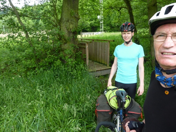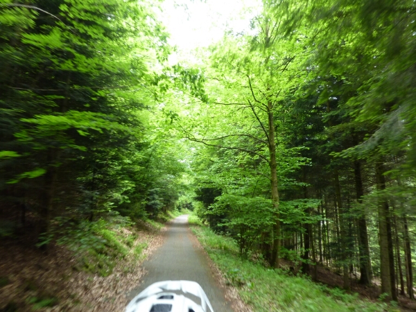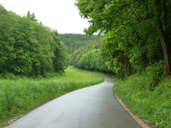 Das Tal der Alb hat uns sanft auf 380m hoch geführt. Leider sprang unterwegs einmal die Kette ab und wir mussten das kleinste Ritzel abmontieren, um sie wieder frei zu bekommen. Die Wolken hingen dunkel und tief über dem engen Tal, bis auf drei Tropfen blieb es aber trocken. Die meiste Zeit führte der Radweg oberhalb der Bundesstraße durch den Wald.