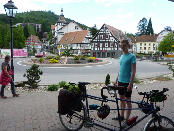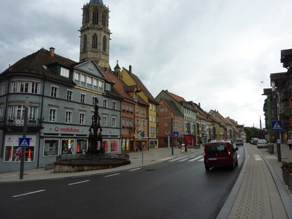 15:45 Uhr – Das waren jetzt eineinhalb Stunden im Regen bis hierher nach Dornstetten. Die Altstadt entlang der Hauptstraße ist sehr schön hergerichtet mit vielen alten Fachwerk- und Steinhäusern. Der Kirschstreusel war sehr lecker. Unter den Regensachen ist es feucht kalt. Thomas hat seine Regenjacke ausgezogen und fährt (im Windschatten) im T-Shirt mit Warnweste. Seine Schuhe sind patsch nass.