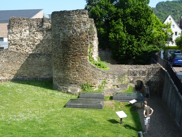 In Boppard haben wir uns die fränkischen Gräber an der Stadtmauer abgeschaut. Von meinem Bruder sind die Zeichnungen und ein Onkel hat eine Hinweistafel gestiftet.