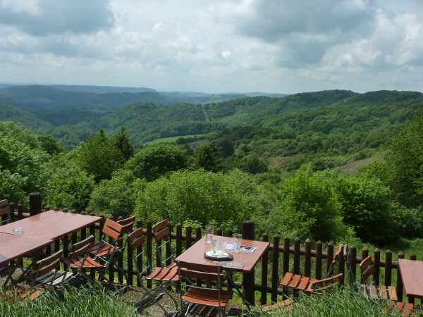 13:40 Uhr – Wir machen gerade Kuchen/Kässpätzle-Pause im Ausflugslokal Falkenstein auf 450m mit herrlicher Aussicht in den Pfälzer Wald. Hier ist es sonnig mit vielen Sommerwolken und warm.