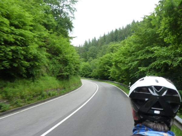 Die Abfahrt an Burg Falkenstein vorbei war mörderisch. 25% Gefälle waren mir zu steil. Wir haben in der ersten Kehre angehalten und die Felgen abkühlen lassen. Danach ging es aber weiter so steil bergab, dass ich Schritttempo fahren musste. Erst als die Straße gut einsehbar war, habe ich die Bremsen losgelassen und es wurde eine rasante Schussfahrt ins Tal.