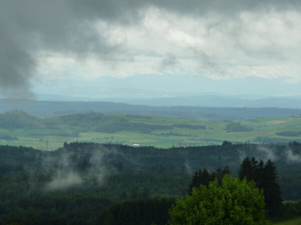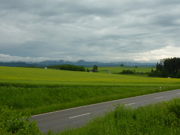 Kurze Zeit später waren wir auf der letzten Anhöhe vor dem Bodensee und plötzlich tat sich ein umwerfendes Panorama auf. Die Wolken hingen zum Greifen tief, dazwischen aber war der Hohentwiel und beide Enden des Bodensees zu sehen und dahinter zwischen den Wolken die Kette der Alpen-Berge. Wir haben lange gestanden und nur geschaut.