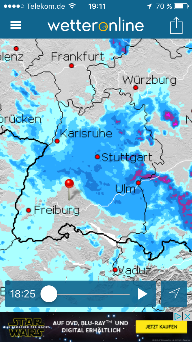 Um 18 Uhr fielen die letzten Tropfen, dann war es bis zur Ankunft hier in Rottweil trocken. Der Screenshot zeigt wie groß das Regengebiet war, das durch das wir hindurch mussten.