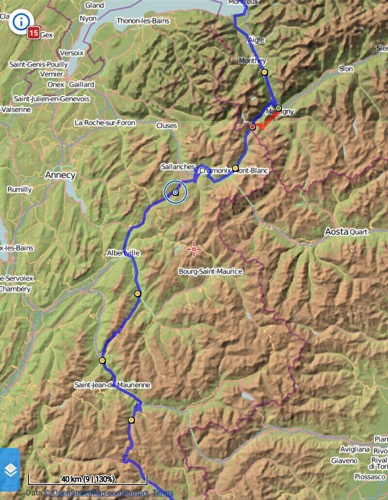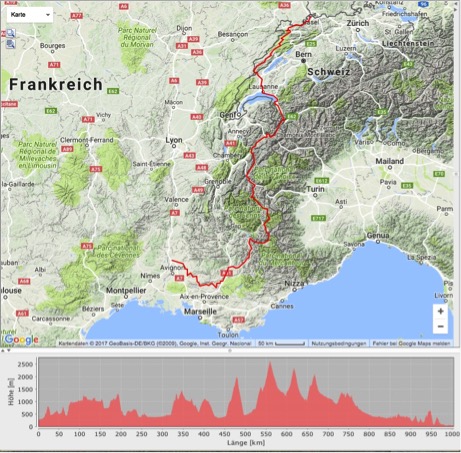 Nachtrag: Nun ist es Anfang April. Wir sind für zwei Wochen in Bonnieux am Nordrand des Luberon. Heute haben wir in Orange auf dem kleinen Platz zu Mittag gegessen an dem auch das letzte Hotel der Tour liegt. Alle Übernachtungen sind gebucht. Ich habe die Strecke bei der Gelegenheit noch etwas verfeinert, Tagesetappen verkürzt und Höhenmeter gleichmäßiger verteilt. Der Anstieg nach Chamonix scheint die meisten Höhenmeter zu haben. Am steilsten ist…, egal, ich lasse mich überraschen und hoffe, dass die Vorausbuchungen die Tage und die Abende schon mal etwas entspannen. Bleiben meine Kondition und das Wetter als größte Unsicherheitsfaktoren. Ich übe mich nun in Gelassenheit!