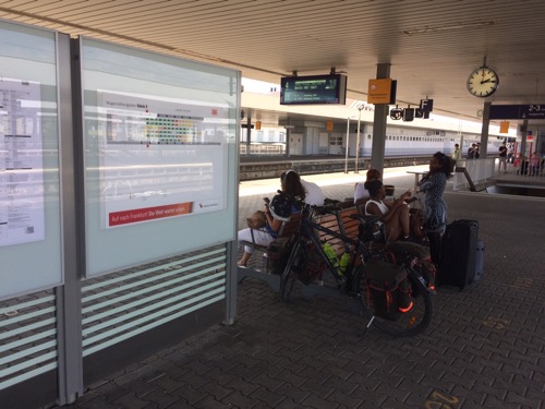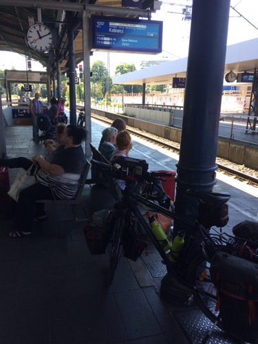 9:35 Uhr – So schlecht war die Nacht gar nicht. Ich habe die Klimaanlage laufen lassen. Handtücher habe ich mir gleich nach dem Aufstehen geholt. Die Waschmaschine hatte gestern wohl ein Problem. Jetzt bin ich am Bahnhof und natürlich wird noch kein Gleis angezeigt. Ich muss also gleich wahrscheinlich in Hektik die Treppen runter und rauf mit dem schweren Rad, es gibt ein Fahrradrille, aber weder eine Rampe noch einen Aufzug.