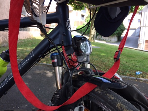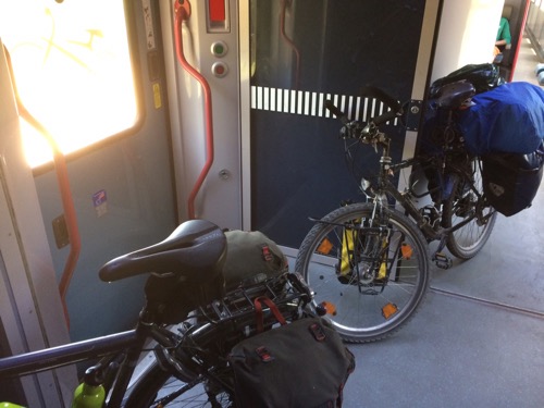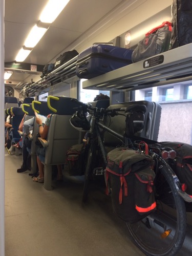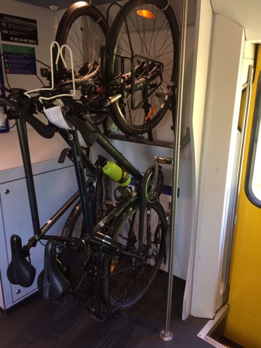 15:10 Uhr – 30 min Verspätung. Bin im Zug, das Fahrrad auch und der reservierte Platz ist in Fahrtrichtung im Schatten mit Blick auf das von der Decke baumelnde Rad. Jetzt tief durchatmen! und den letzten Urlaubstag genießen.