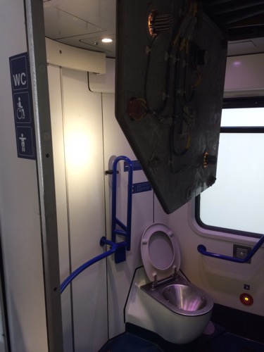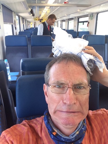 14:30 Uhr – Nix ist gut: Mich hat eine Deckenplatte auf der Toilette fast erschlagen. Als ich die Tür schloss, traf mich der Schlag. Der Schaffner holt mir gerade ein Kühlpack.