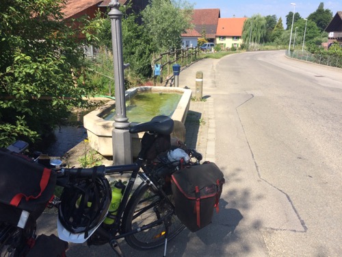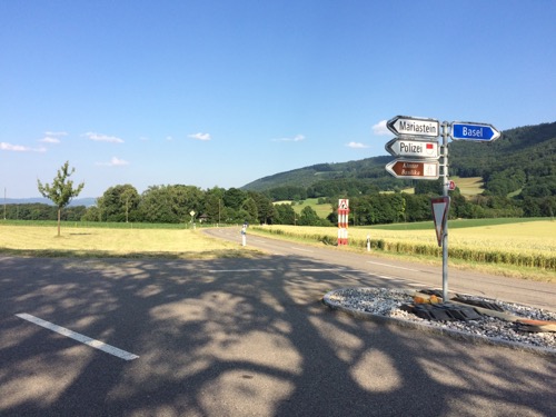 17:15 Uhr – Therwil – Die ersten 10 km sind geschafft. Habe im Kiosk Wasser nachgekauft: 35° im Schatten. Die Radinfrastruktur in Basel und auf der V7 sind genial, die Beschilderung fehlerlos. Überall gibt es viel Platz und Zone 30.