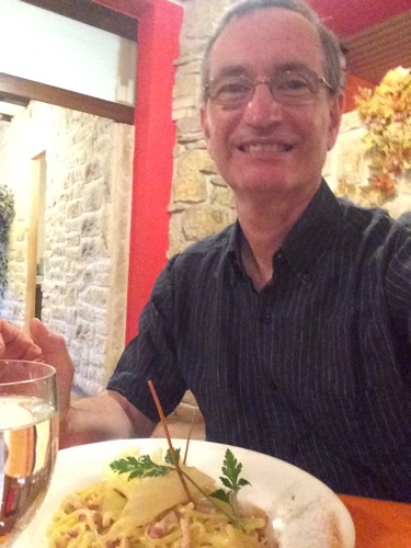 21:15 Uhr – Ich sitze durchaus ziemlich bis völlig erschöpft, aber frisch geduscht in der Pizzeria des Hotels.