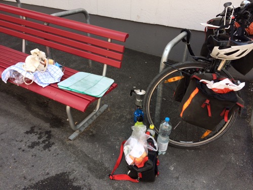 12:20 Uhr – Kaffeepause an der Bushaltestelle vor dem Coop La Chaux-de-Fonds. Könnte sicher idyllischer sein. Aber das Baguette ist frisch, der Käse von gestern warm und weich, dazu Fanta Lemon (!!!) und Joghurt. Ich habe sogar noch die Kaffeemaschine angeschmissen. Alles perfekt.