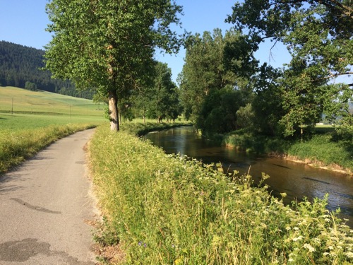 Gleich geht es runter an den Doubs nach St. Ursanne. Dort will ich Brot, Käse und Äpfel kaufen. Danach kommt dann der «richtige» Anstieg mit ca. 600 Hm. Davor brauche ich viel Stärkung und Pause.