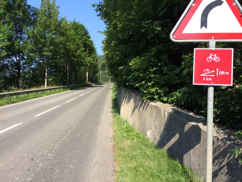 Das Schild war eine gemeine Verharmlosung! Es ging über weite Strecken mit 10 – 11 % bergan. Das war furchtbar anstrengend, musste etwa alle 50 Hm anhalten, manchmal öfter, zum Puls runterfahren, Trinken, Käppi nass machen, Stöhnen.