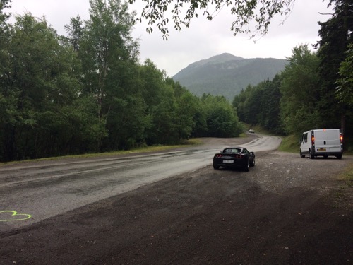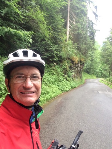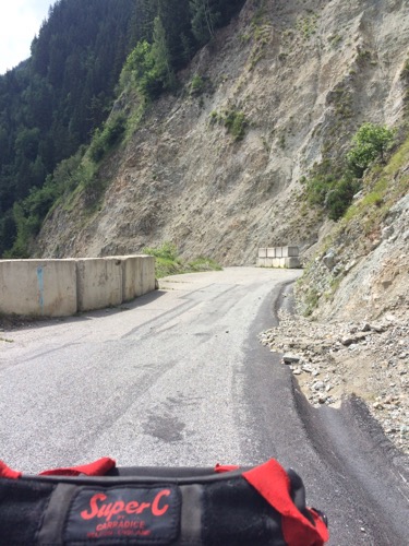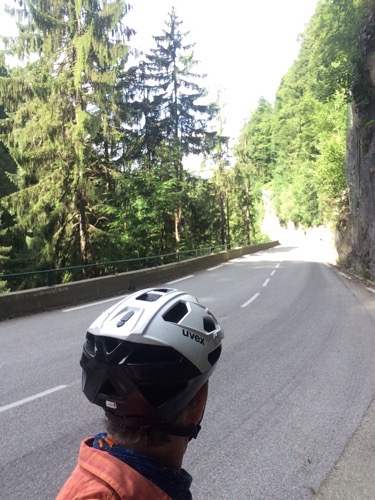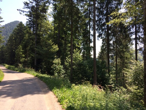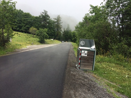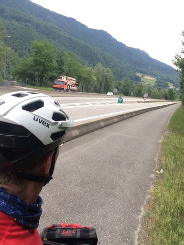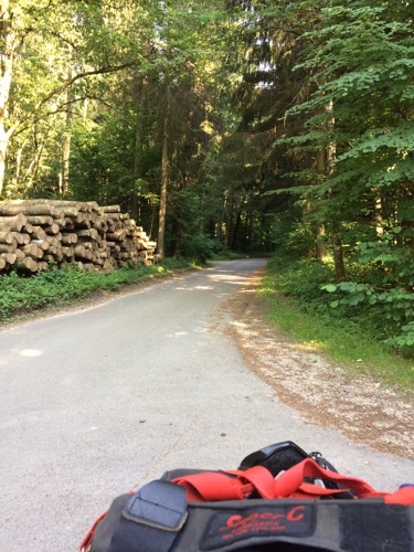 14:35 Uhr – Kurze Zeit später ging es links in den Berg und auf der anderen Seite steil bergab auf einer großen Straße. Das war mal eine geile Abfahrt! Da jodelte es mehr als einmal aus mir heraus. Für den Aufstieg habe ich nur ein Rosenkranzgesätz gebraucht, war also nicht viel.