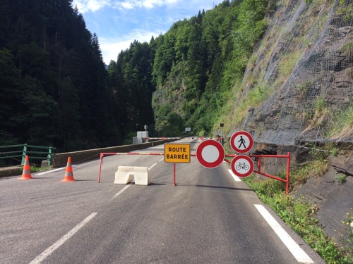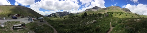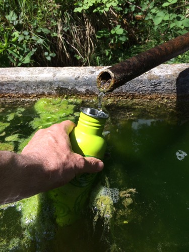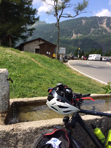 10:30 Uhr – Erster Pass und Abfahrt liefen im schattigen Tal sehr angenehm. Temperatur 25 – 30° schon jetzt. Ich wechsle alle 10 min zwischen der Schweiz und Frankreich. Ich glaube, das ist ein Schweizer Brunnen.