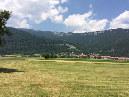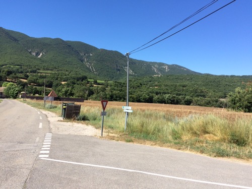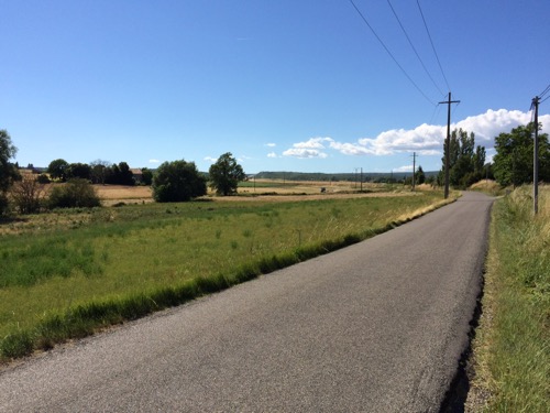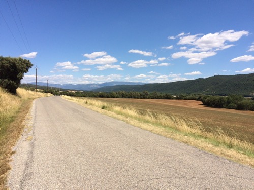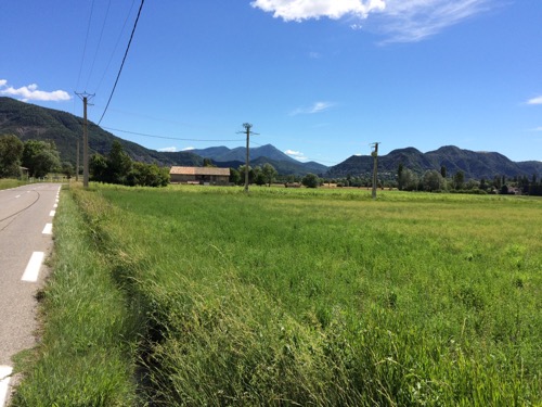 16:08 Uhr – Auf der anderen Seite sieht man das Asse-Tal, durch das ich vorhin gekommen bin. Der Radweg hier ist in einem schlechten Zustand, aber immerhin fast keine Autos. Gerade bin ich an einem für das Dorf riesigen Platz mit Flutlichtanlage vorbeikommen. Da waren sicher vierzig Pétanque-Felder. Die Leute hier meinen es wirklich ernst damit!