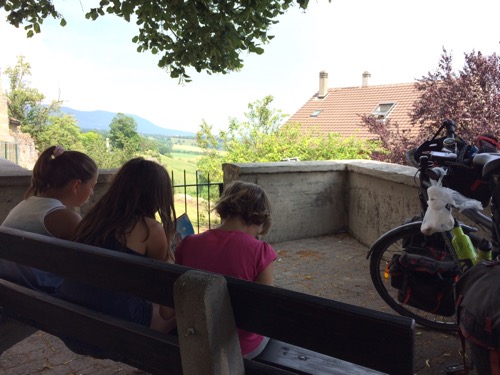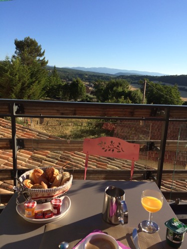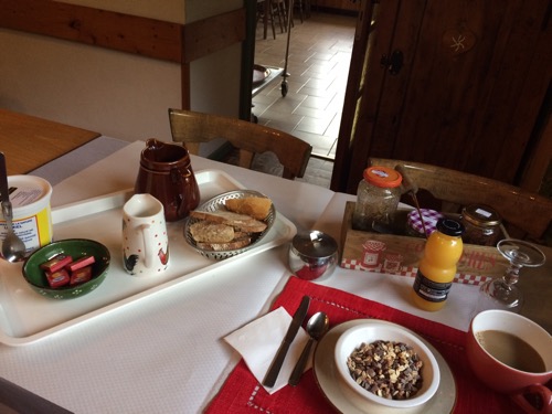 7:35 Uhr – Frühstück auf der Hotelterrasse mit sehr leckerem Baguette und Minicroissants und einem unglaublichen Ausblick. Es ist sehr ländlich hier, die Schwalben zwitschern, und der Wind trägt den Geruch eines Kuhstalls herüber.