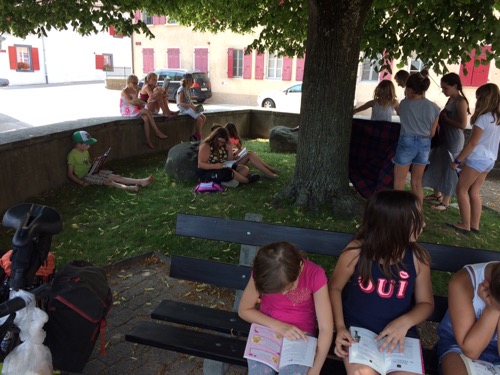 Und kaum liege ich auf den Sitzkissen im Schatten, da kommt eine Grundschulklasse zur Stillarbeit.
