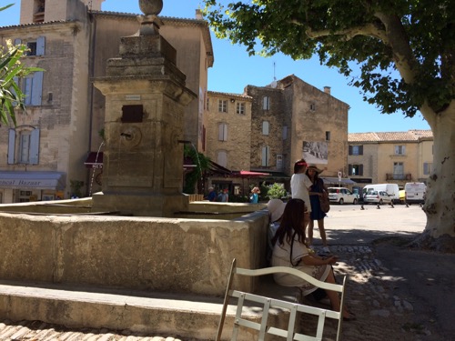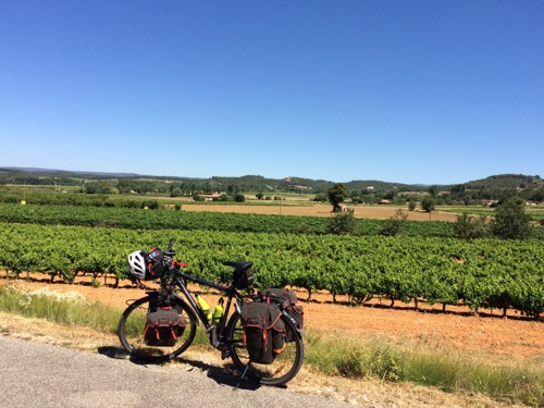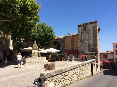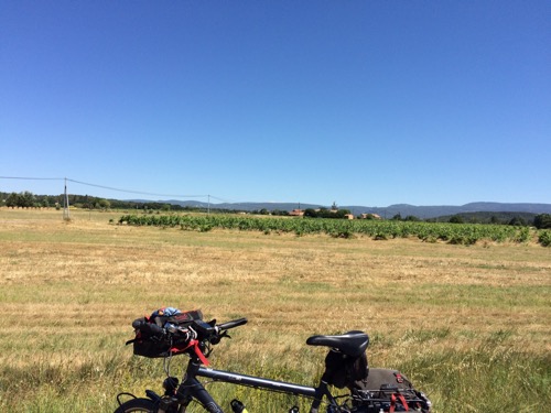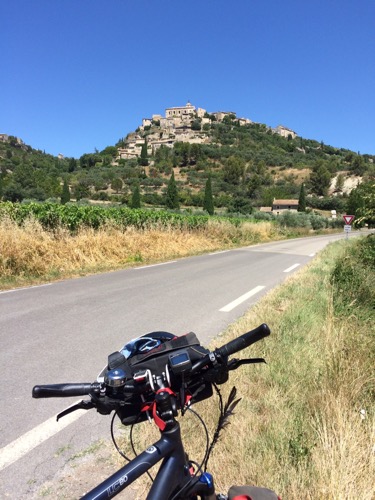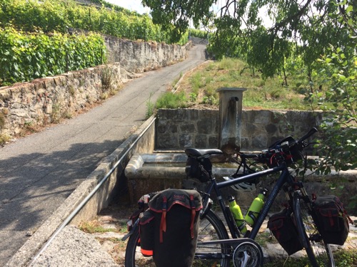 16:05 Uhr – Nach der schnellen Abfahrt auf der flachen fast leeren Hauptstraße (echt dumm gelaufen auf dem Hinweg), hat mich dann die Planung sehr schön durch die Weinberge geführt. Ein WC Public in Cabrières-d’Avignon hat meine Wasservorräte gefüllt und damit ging der letzte Anstieg hinüber nach Lagnes ohne Probleme. Jetzt bin ich im Café de la Fontaine.