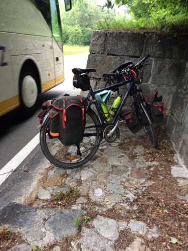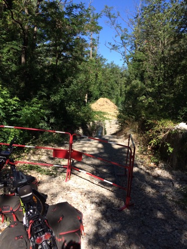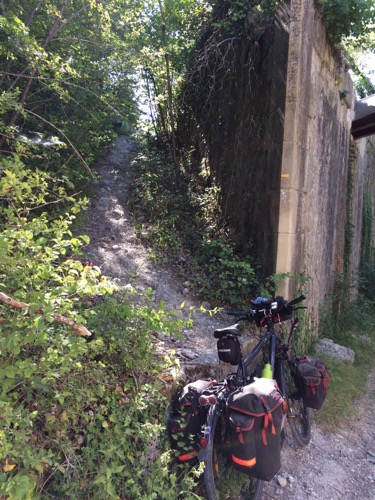 Geschafft! Die einen halben Meter hohe Mauer hinab musste ich das schwere Rad absenken. Nie wieder ungeteerte Wege!!!
