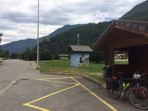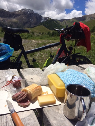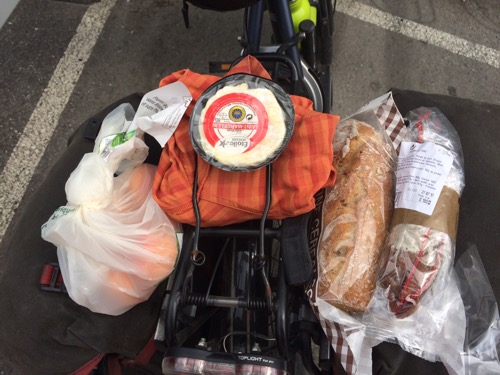 13:00 Uhr – Nach der letzten Kaffeepause in Saint-Didier. In der Bäckerei gab es nur noch Pain au Chocolat, kein Baguette. Das habe ich natürlich sehr gerne genommen. Als Unterlage für Käse und Wurst habe ich zum Glück noch einige Scheiben Knäckebrot.