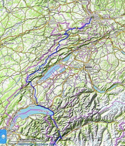 Mit dem Direktzug nach Basel soll die Reise starten. Die schweizer Veloroute 7 bringt mich über 250 km durch das Jura nach Lausanne am Genfer See. Von dort will ich dem Rhone-Radweg bis Martigny folgen. Dann geht es hinauf nach Chamonix-Mont-Blanc und über Passy nach Albertville.