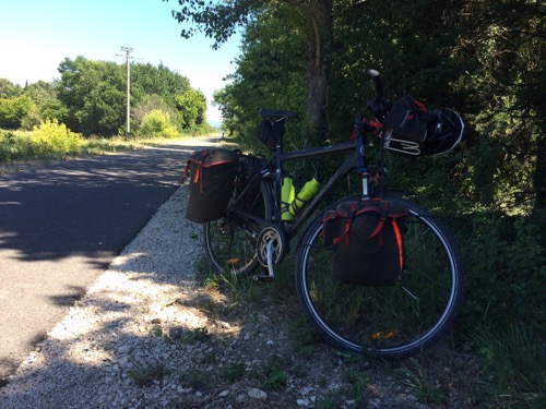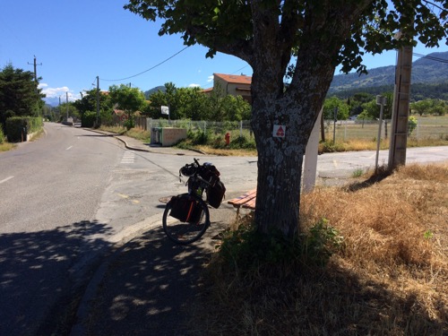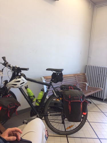 12:55 Uhr – Ich bin im Zug und führe erste Gespräche mit anderen Radreisenden. Ich bleibe beim Rad bis sie in Valence raus sind. Die Tür wollte nicht aufgehen. Der Schaffner musste in Orange noch helfen.
