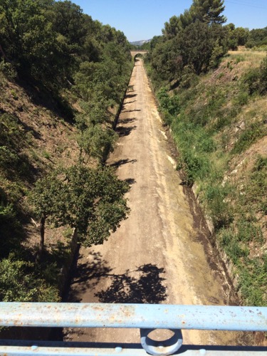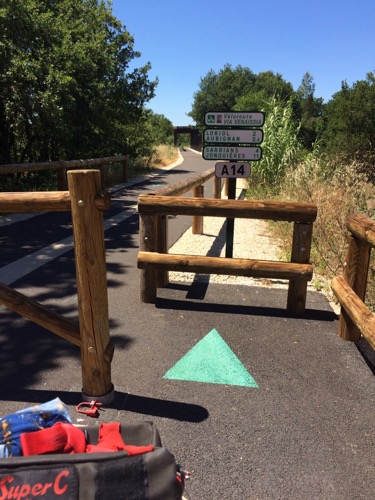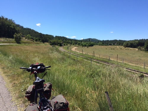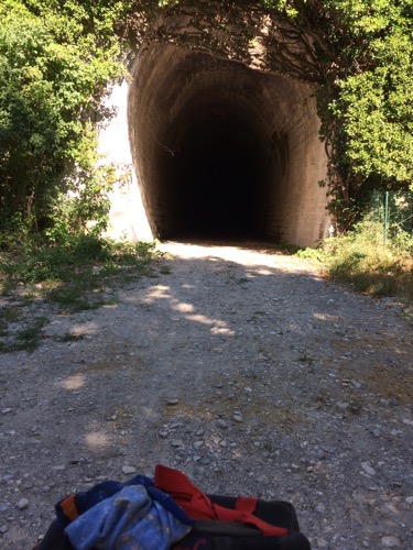 9:35 Uhr – Schon dreizehn Kilometer mit super Geschwindigkeit, nur 22° C und ohne störenden Wind. Den Mourre Nègre habe ich schon vor mir. Hier beginnt die alte Bahntrasse.