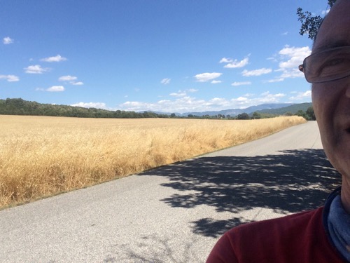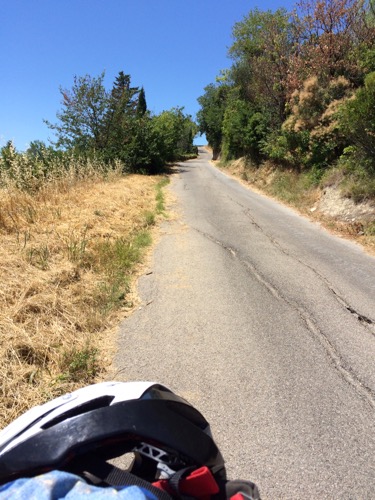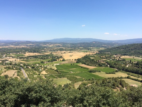 11:35 Uhr – Da vorne liegt Lacoste mit dem Schloss des Marquis de Sade. Links kann man im Gegenlicht vielleicht etwas von Bonnieux erkennen. 40° in der Sonne, bald ist Zeit für die Siesta!