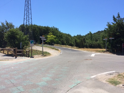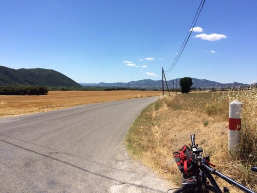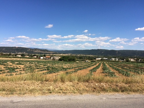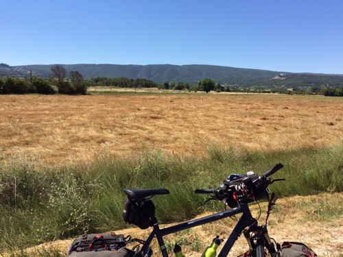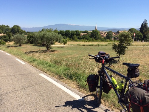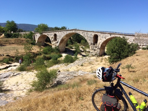 Gleich kommt der Pont Julien. Und hier sehr ich erstmals die Spitze des Mont Ventoux wieder. Ohne Teleobjektiv ist das aber schwer einzufangen. Und die Bergspitze ist ja auch noch blendend weiß. Aber vielleicht sieht man ja doch was.