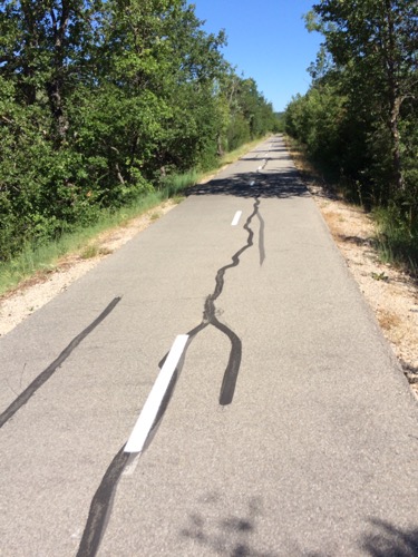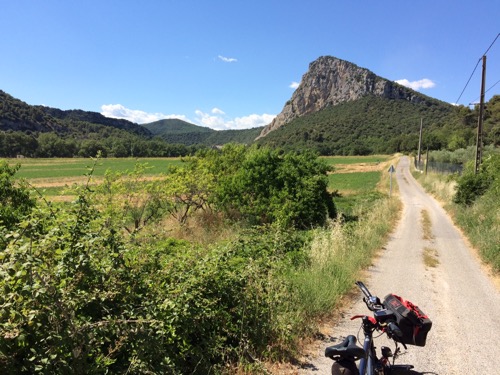 11:00 Uhr – Links vor mir sehe ich schon Lacoste und die Bergkirche von Bonnieux, in der wir zur Ostermesse waren, rechts leuchten die Ockerfelsen von Roussillon in Rot und Orange. Der Calavon-Radweg ist wirklich sehr gut, nicht immer auf der Bahntrasse, aber gut ausgebaut und beschildert.