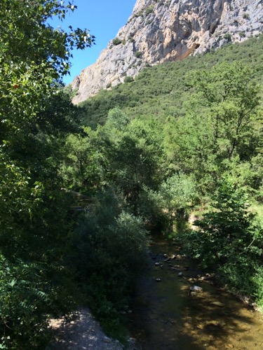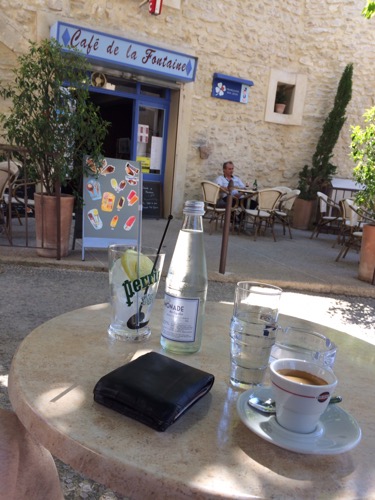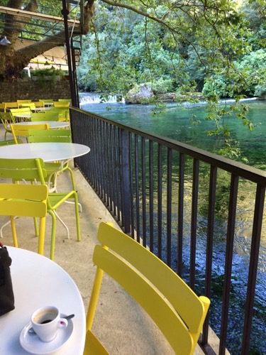 9:35 Uhr – Erinnerungskaffee in Fontaine de Vaucluse. Hundert Meter weiter oben kommt all dieses Wasser aus dem Fels. Es ist die größte Quelle Europas.