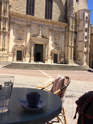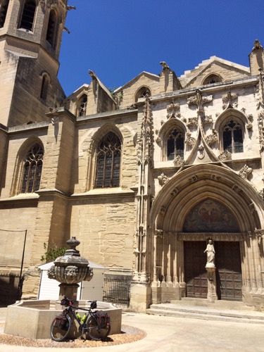 13:45 Uhr – Die Kathedrale Saint-Siffrein von Carpentras. Der Weg über Nebenstraßen ins Stadtzentrum war sehr schön zu fahren. Es ging durch Felder und Weinberge sanft bergab.