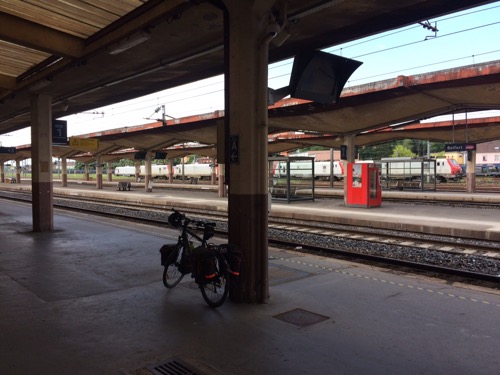 12:05 Uhr – Ich bin aufgeregt und bin einfach schon früher los. Vom Hotel zum Bahnhof habe ich in aller Ruhe geschoben. Der Zug kommt aus Marseille und hat 5 min Verspätung. Er hält hier auf der Bahmhofseite, ich muss also keine Treppen bewältigen.