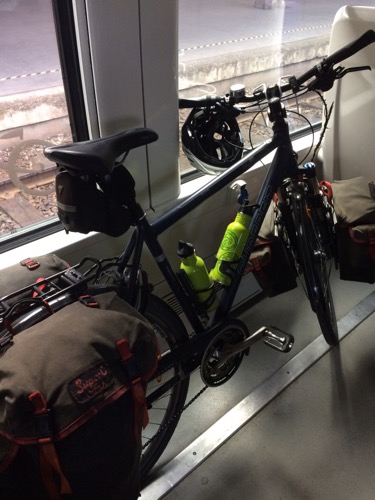 9:58 Uhr – Rad und ich sind im Zug. Hier gibt es sogar Steckdosen für Pedelecs!! Dafür gibt es keine Halteleine. Ich werde meine mal auspacken.