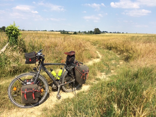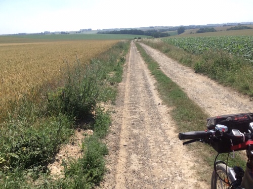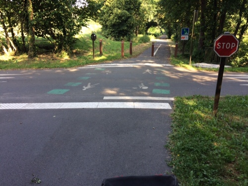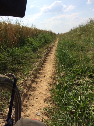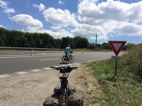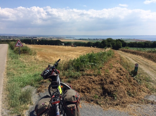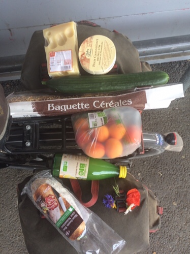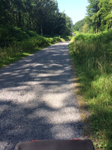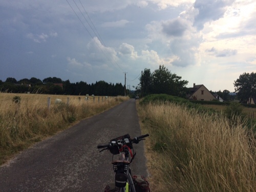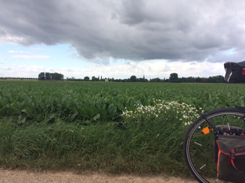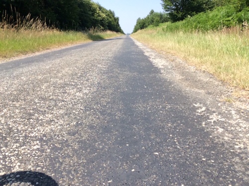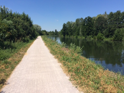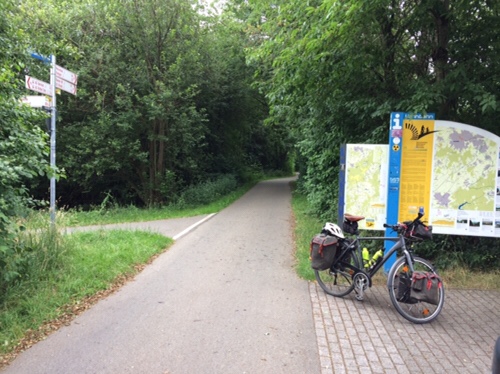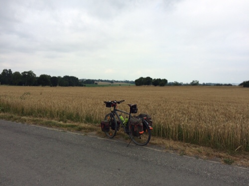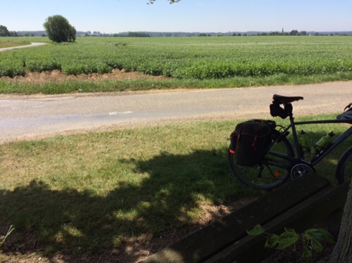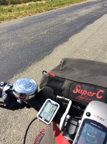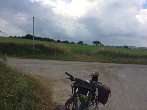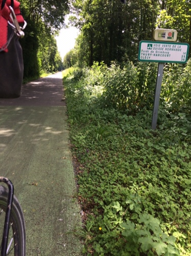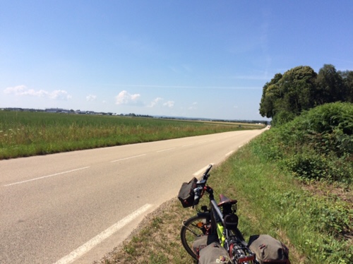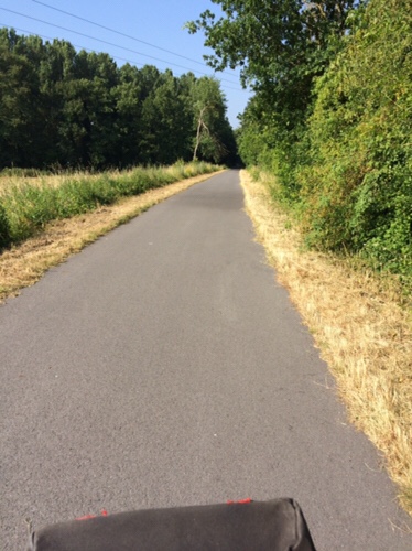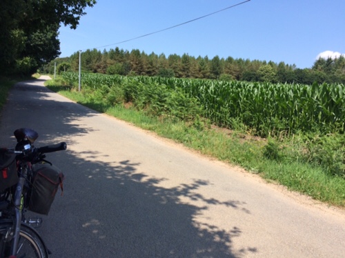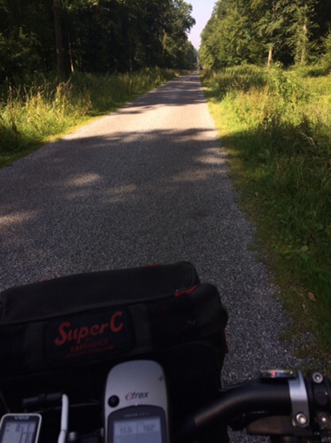 15:00 Uhr – Die Radlerin vor mir hat mich die letzten fünf Kilometer begleitet. Wir haben uns auf Deutsch mit französischen Einschüben unterhalten. Sie war bei ihrer Schwester und hatte eine Tüte Eier am Lenker. Die Trasse wird gerade zum Teeren vorbereitet. Sie wollte sehen, ob sie für mich fahrbar ist und hat extra mit mir einen Umweg von zwei, drei Kilometern gemacht. Das hilft beim Ankommen im fremden Land.